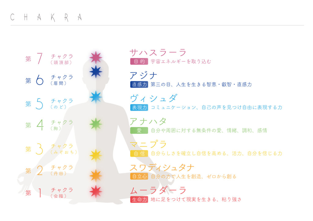 人の身体にはエネルギーを作り出す「チャクラ」という場所があり、それぞれテーマと対応する身体の部位を持ちます。そのバランスを本来の状態へと整えることで、身体的・感情面・精神面はもちろん、実生活へのダイレクトな効果が期待できます。